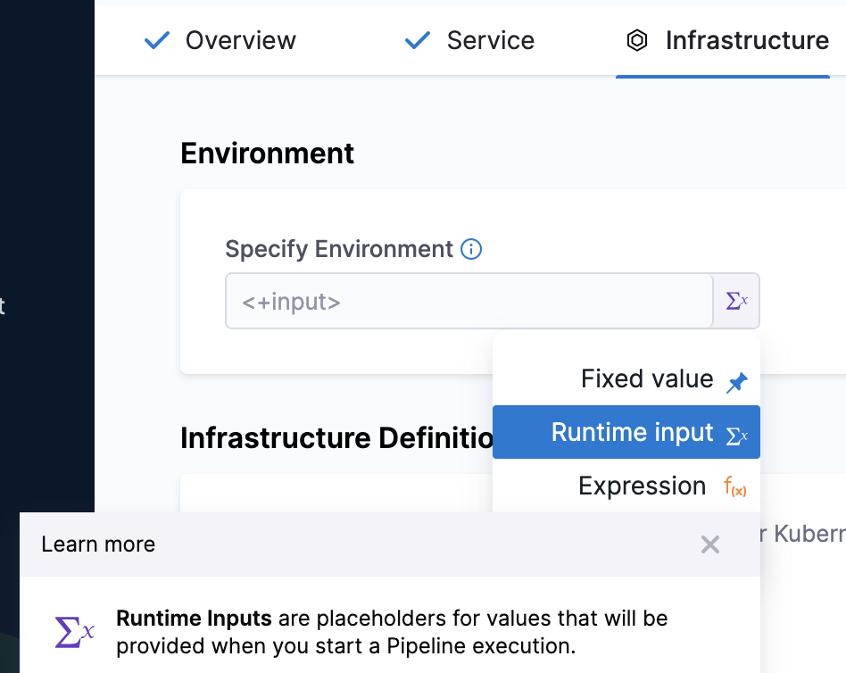 In Infrastructure, in Specify Environment, select the setting for your pipeline execution, for example, Runtime input. Harness pipelines allow you to use fixed values, runtime inputs, and expressions. Environments represent your deployment targets logically (QA, Prod, etc). You can add the same environment to as many stages as you need.